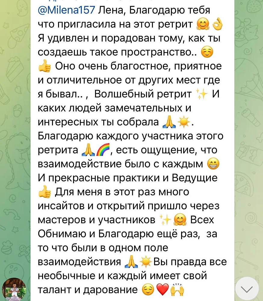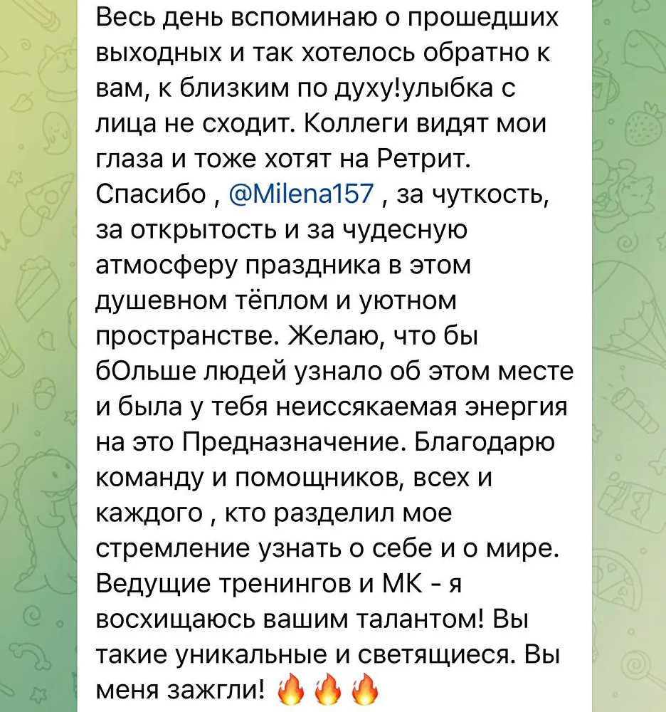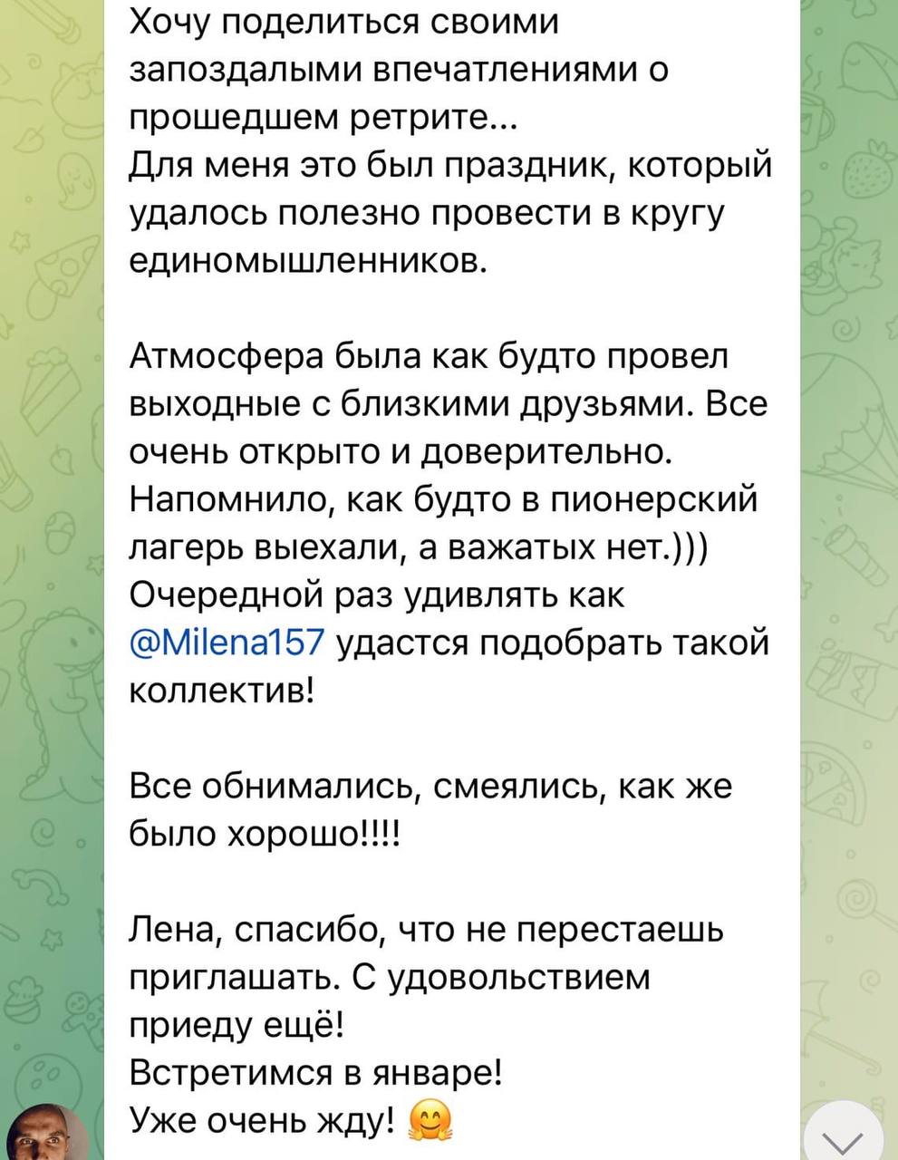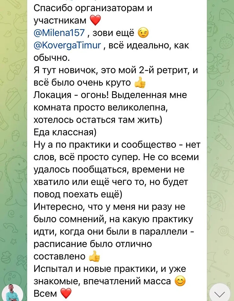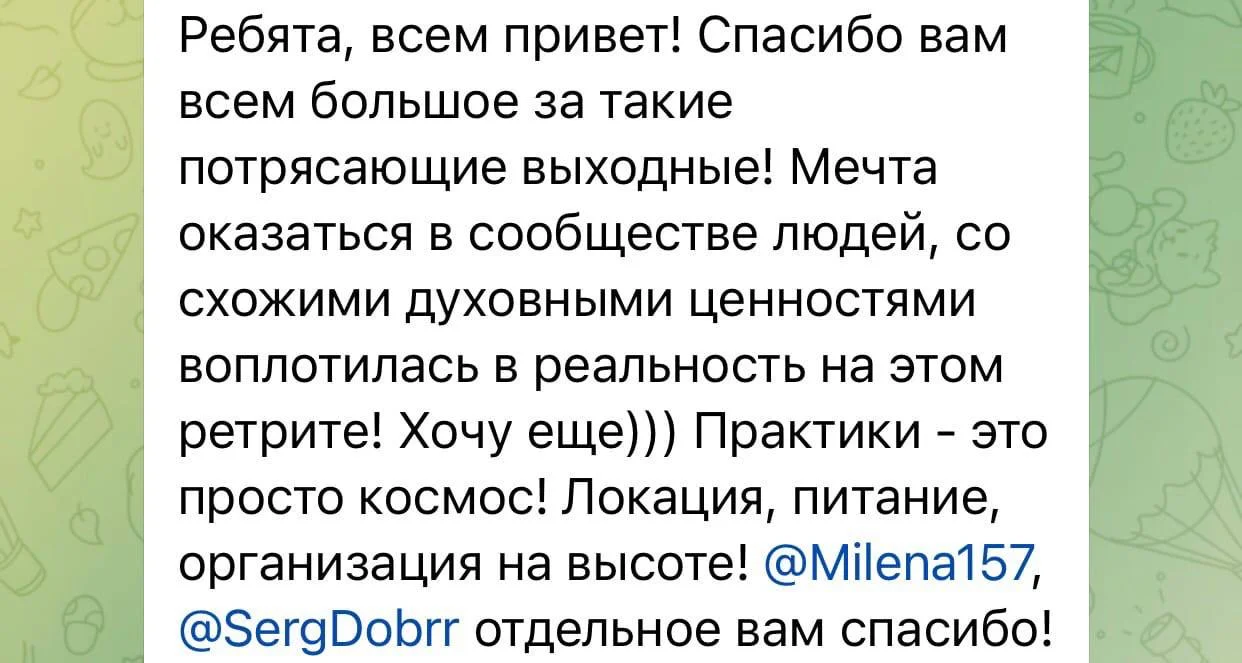 Ретрит — это время, проведённое вдали от повседневной суеты для восстановления сил и духовного роста. Наши ретриты отличаются от других мероприятий с таким названием тем, что в нем можно принять участие в практиках разных мастеров, а также просто приятно провести время и осуществить «перезапуск» своего организма